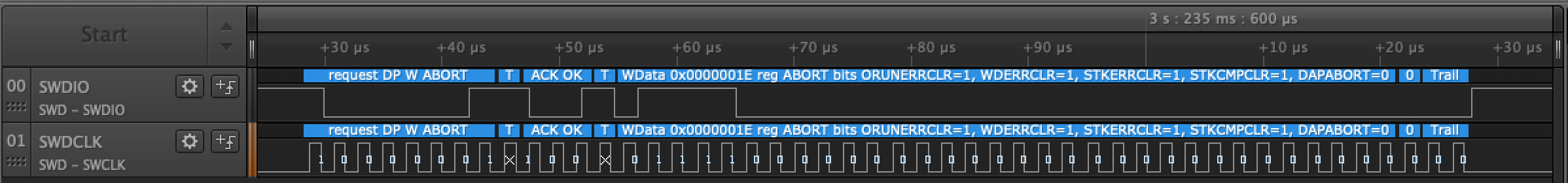 3.235554950000000,SWD,WData 0x0000001E reg ABORT bits ORUNERRCLR=1, WDERRCLR=1, STKERRCLR=1, STKCMPCLR=1, DAPABORT=0