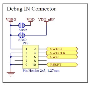 On the nRF52840-DK board I see P18 is labeled as “Debug In”. Looking at the schematics23, I can easily see the pinout: