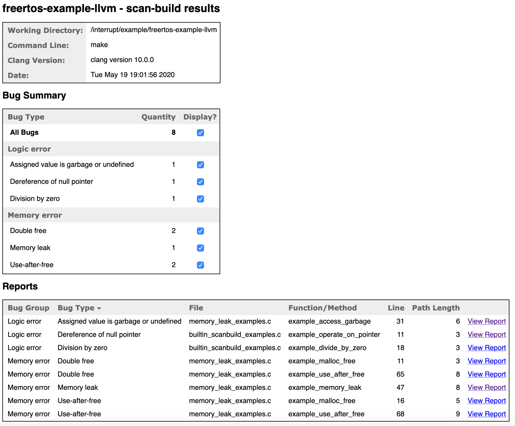 Let’s run scan-build on our example project. We’ll see it finds a few interesting potential issues that neither Clang or GCC noticed during compilation.