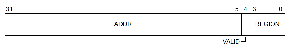 To reduce the number of writes needed to change the configuration, the VALID bit can be set to 1 and the REGION field can be set to change the value of MPU_RNR and apply the write to a different region. For example, if we wanted to set REGION 7 to have a base address of 0x20000000, we could write 0x20000000 | 0x1 << 4 | 0x7 == 0x20000017 to MPU_RBAR. If we then read MPU_RNR, we would see its value is now 0x7.