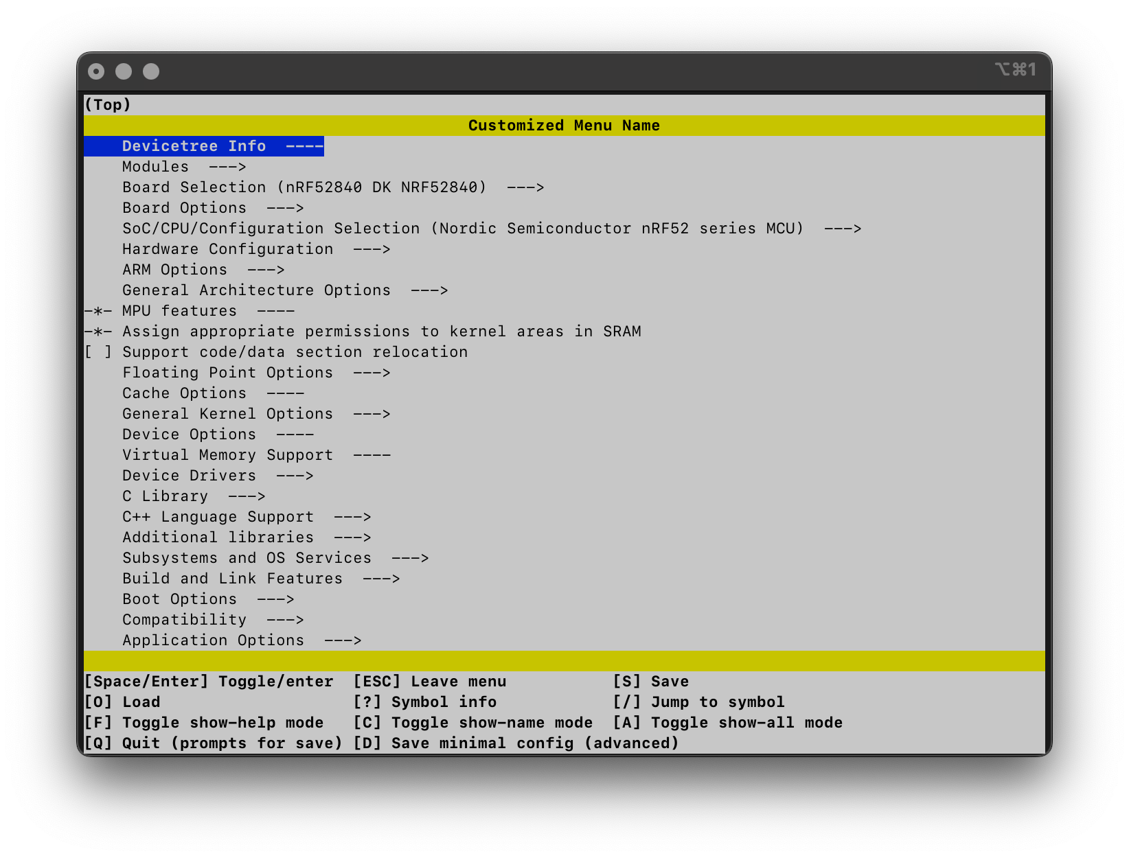 The new, custom main menu name “Customized Menu Name” is only visible in the interactive Kconfig tools, such as menuconfig, and is not used within the generated zephyr/.config file. The interactive tools now also show our newly created menu and symbol.