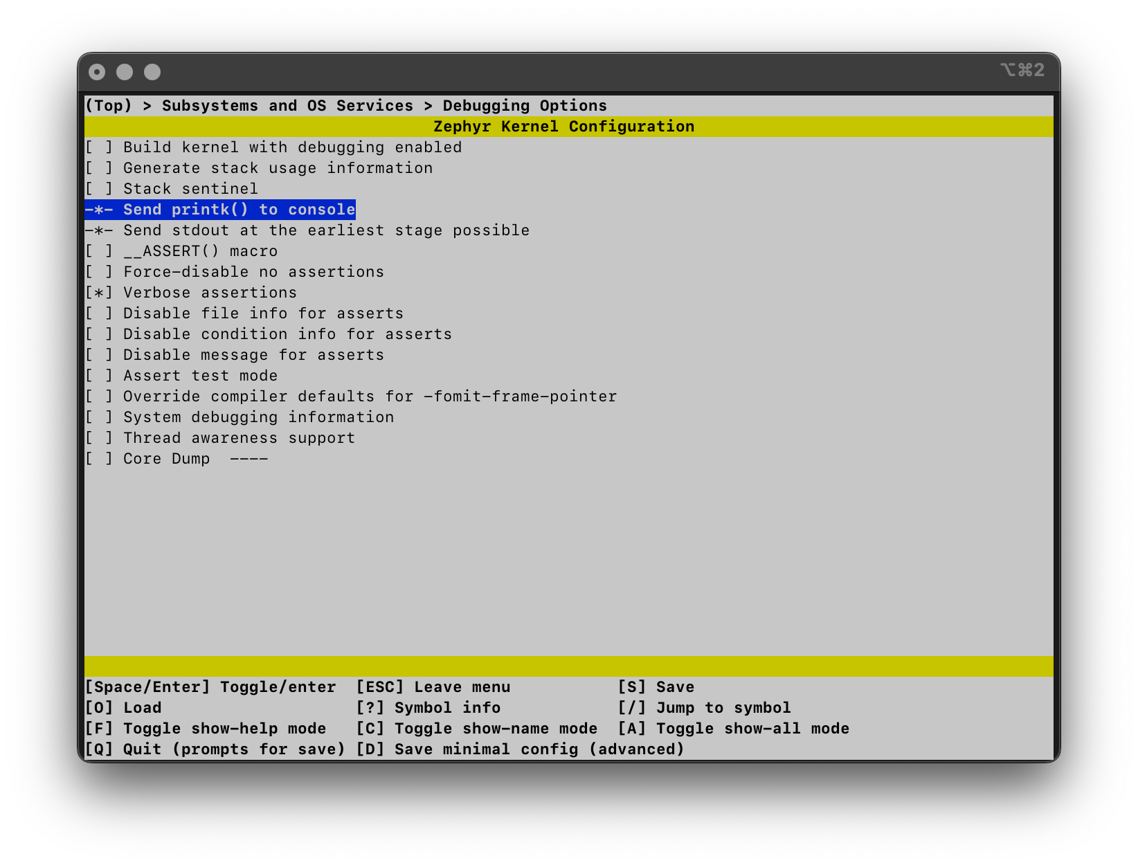 As you can see from the above Kconfig file, unless configured otherwise, PRINTK is enabled by default. We can configure symbols to our needs in the application configuration file prj.conf that we’ve encountered in the previous article. Symbols are assigned their values using the following syntax: